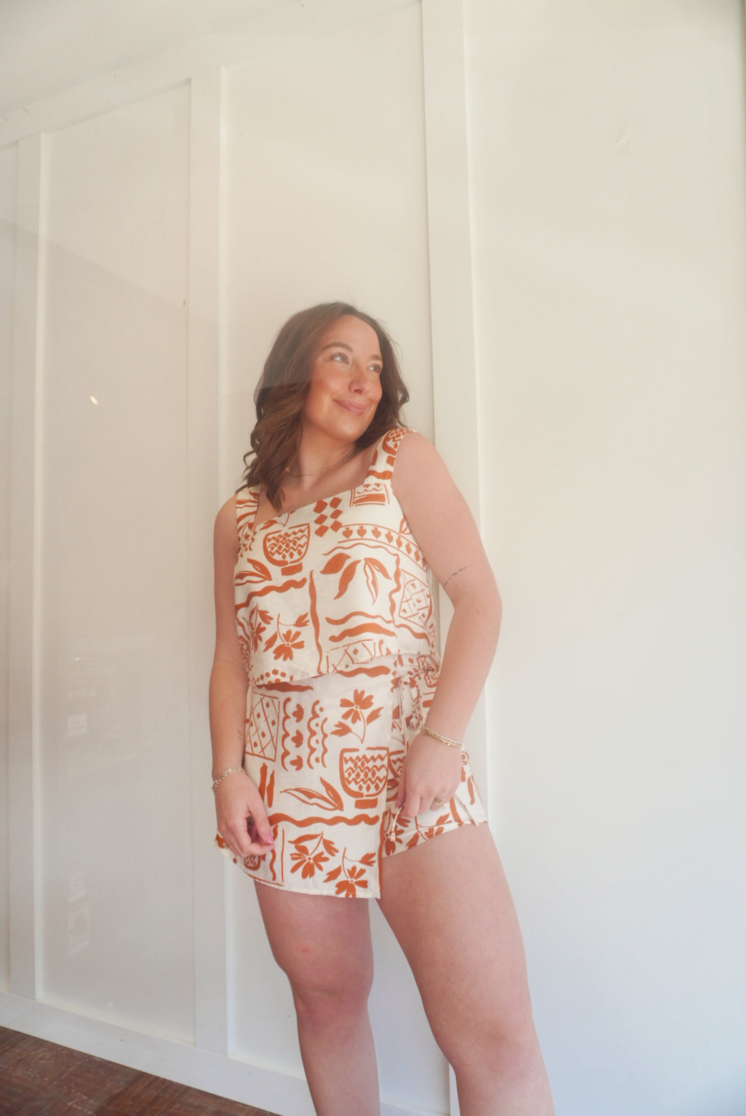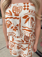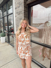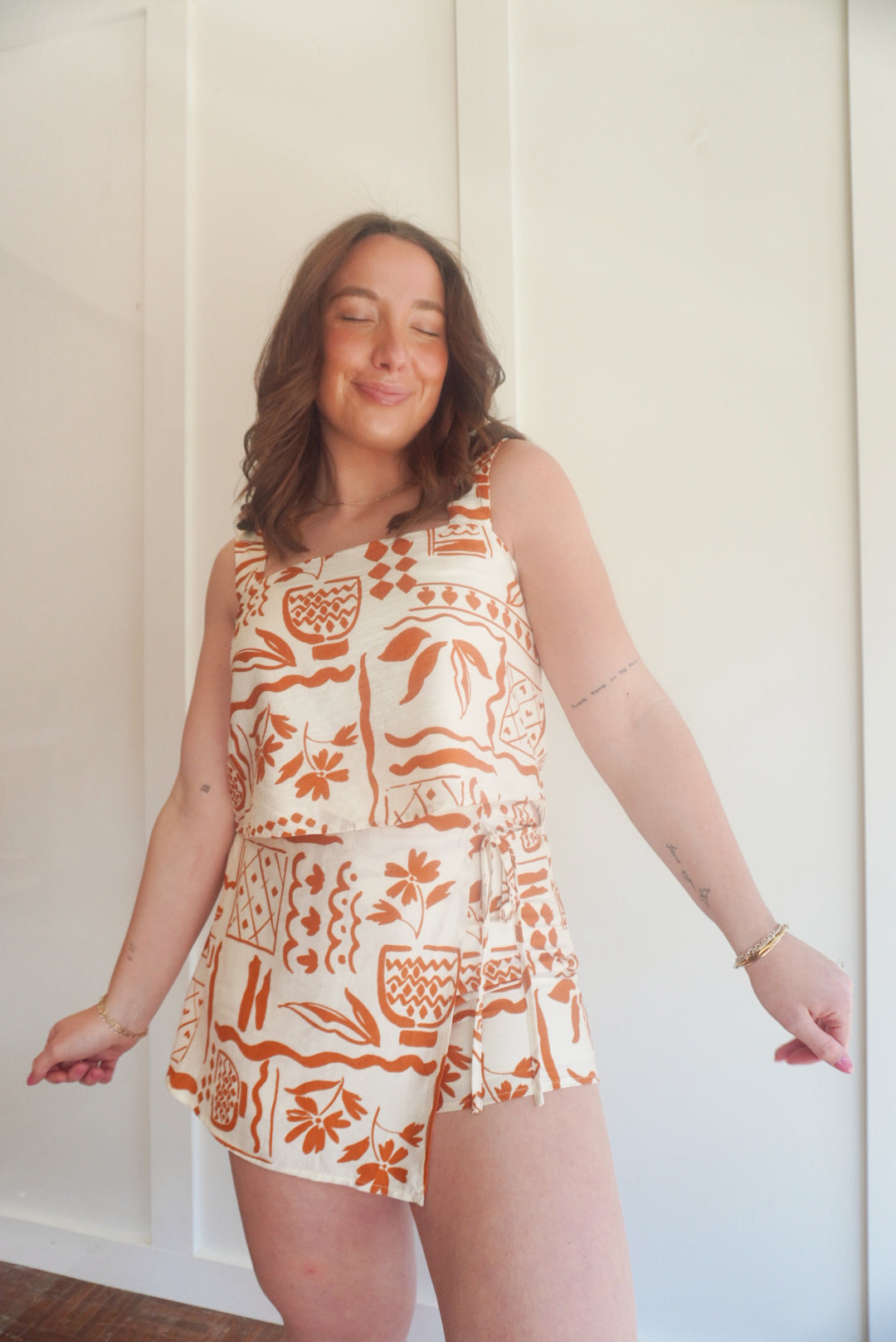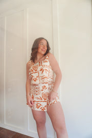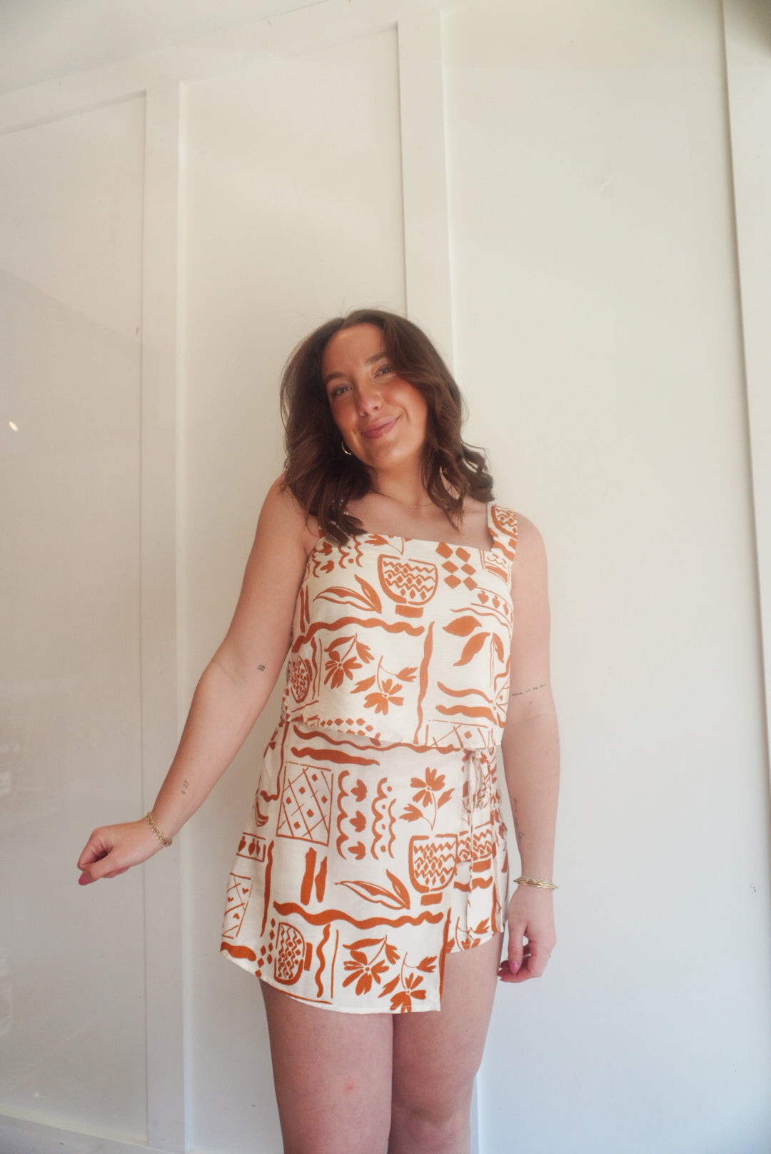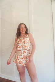 Printed square neck cropped tank with matching printed high waist front tie mini skort