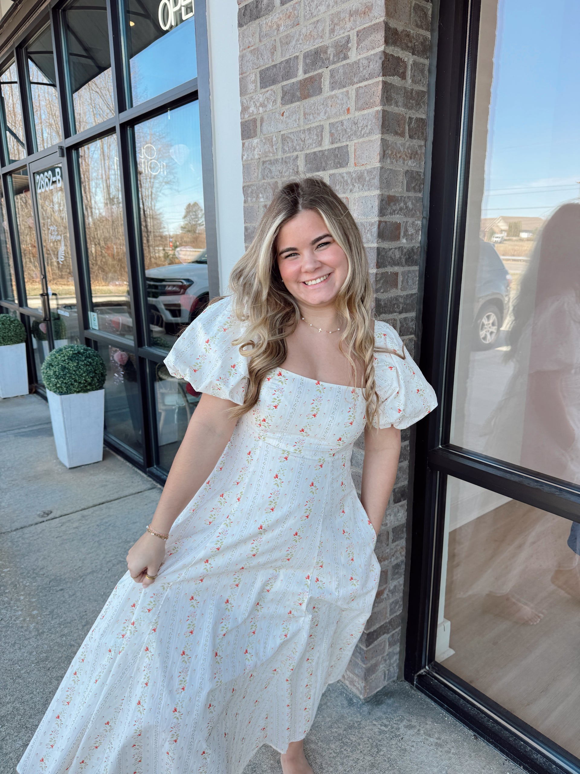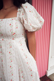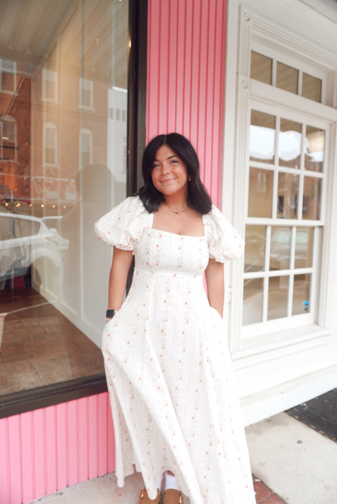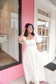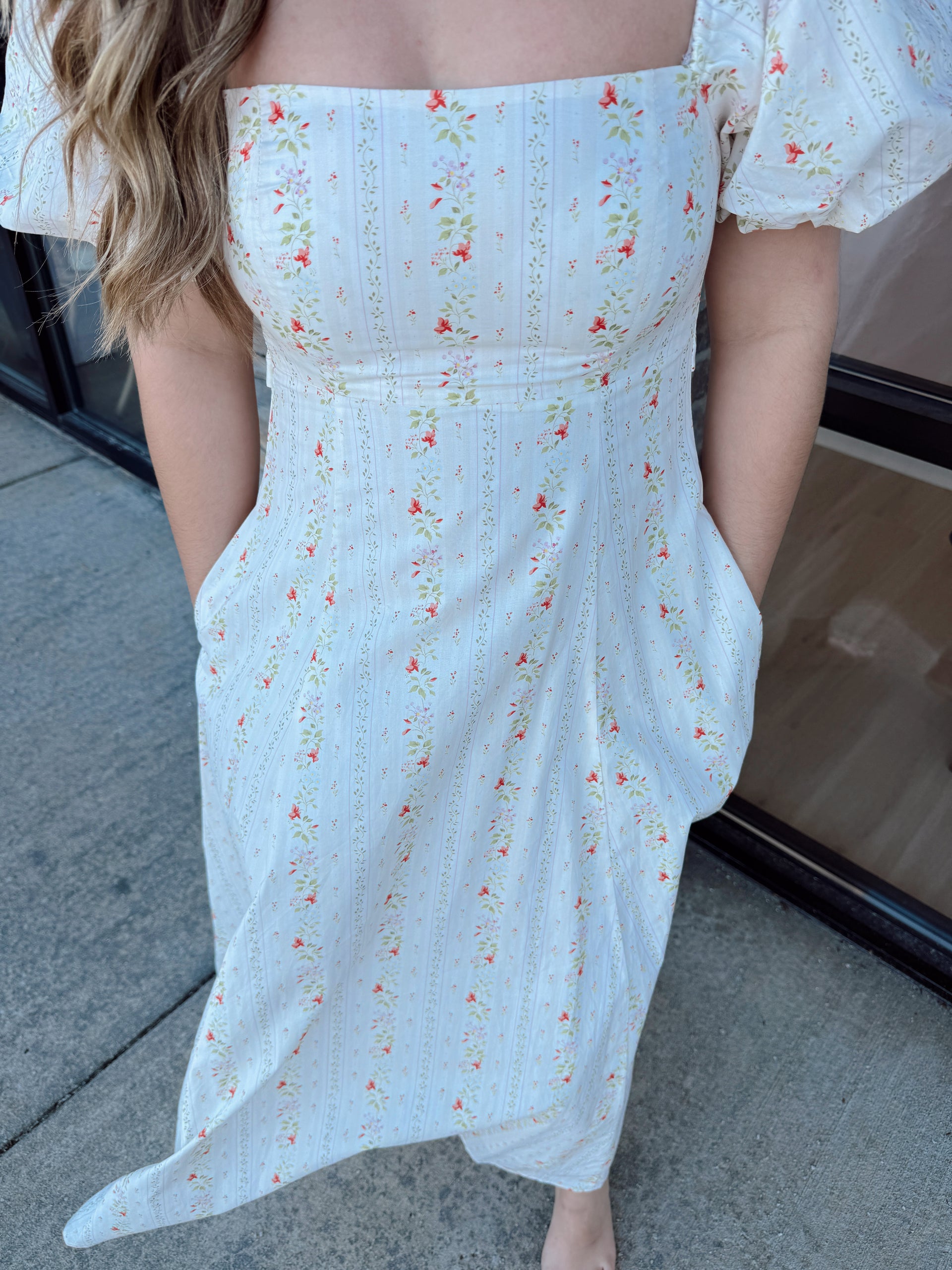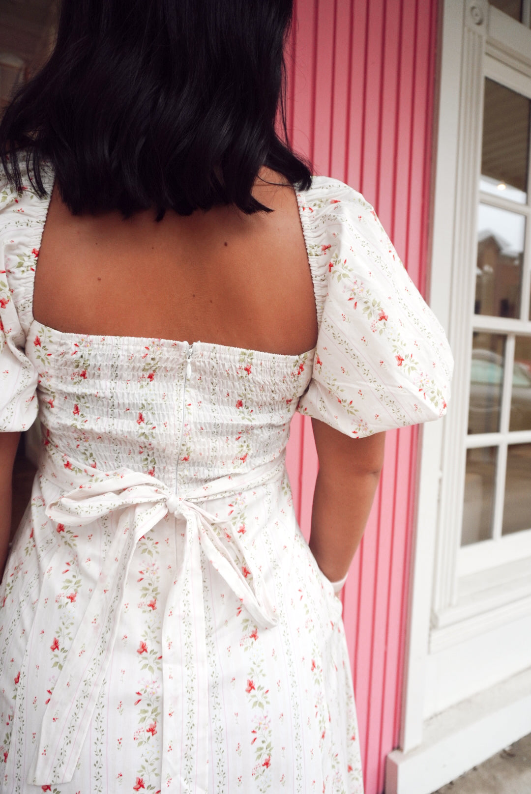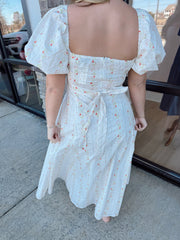 A floral print midi dress featuring puff sleeves and a square neck. Self tie straps for bow detail on back.