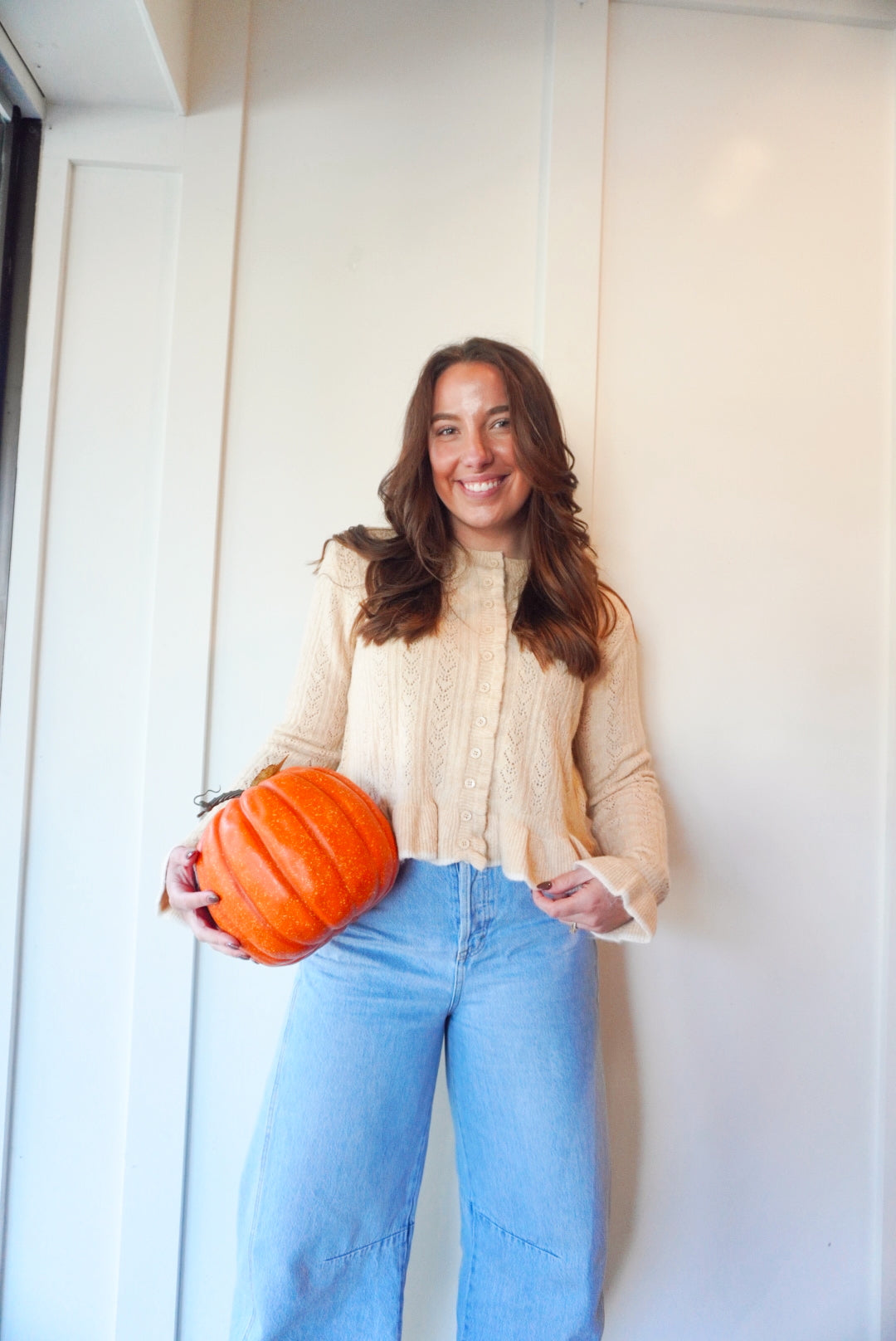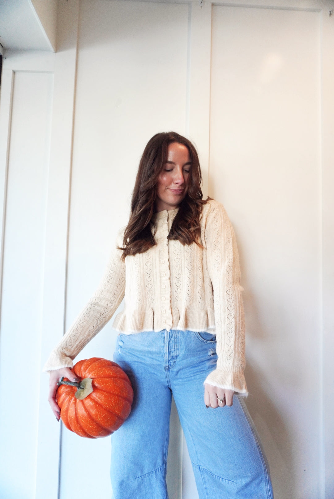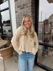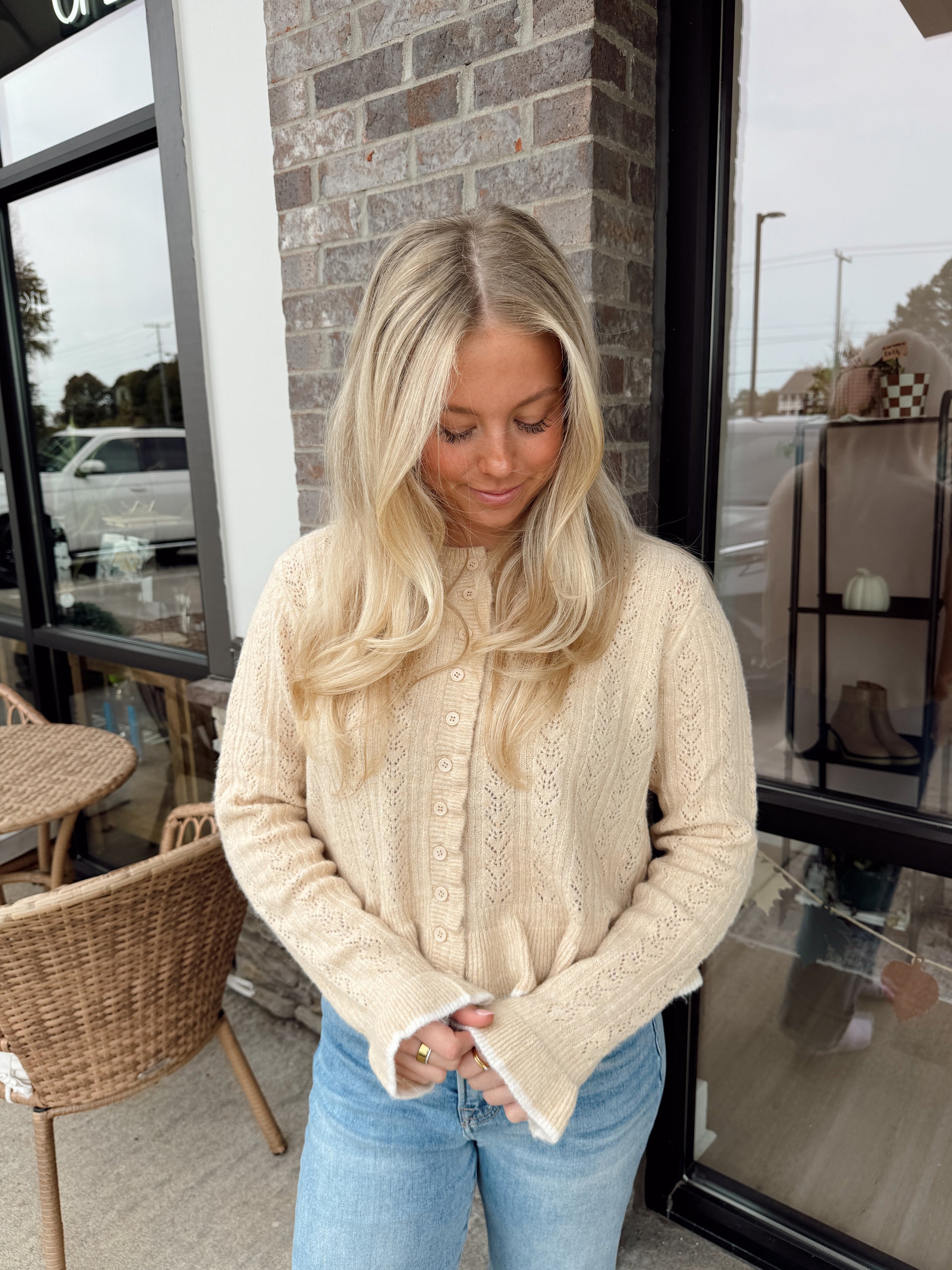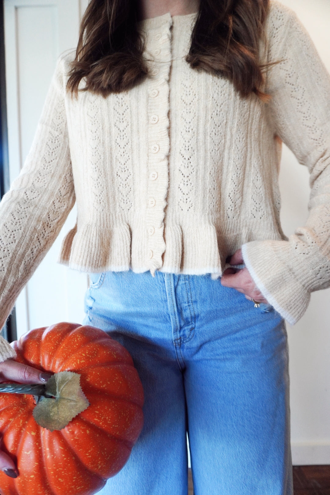 Button front ruffled detail sweater cardigan