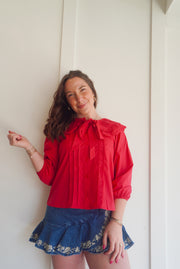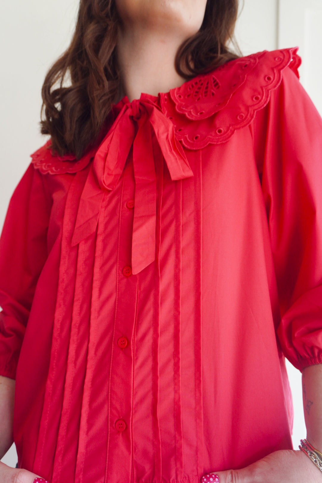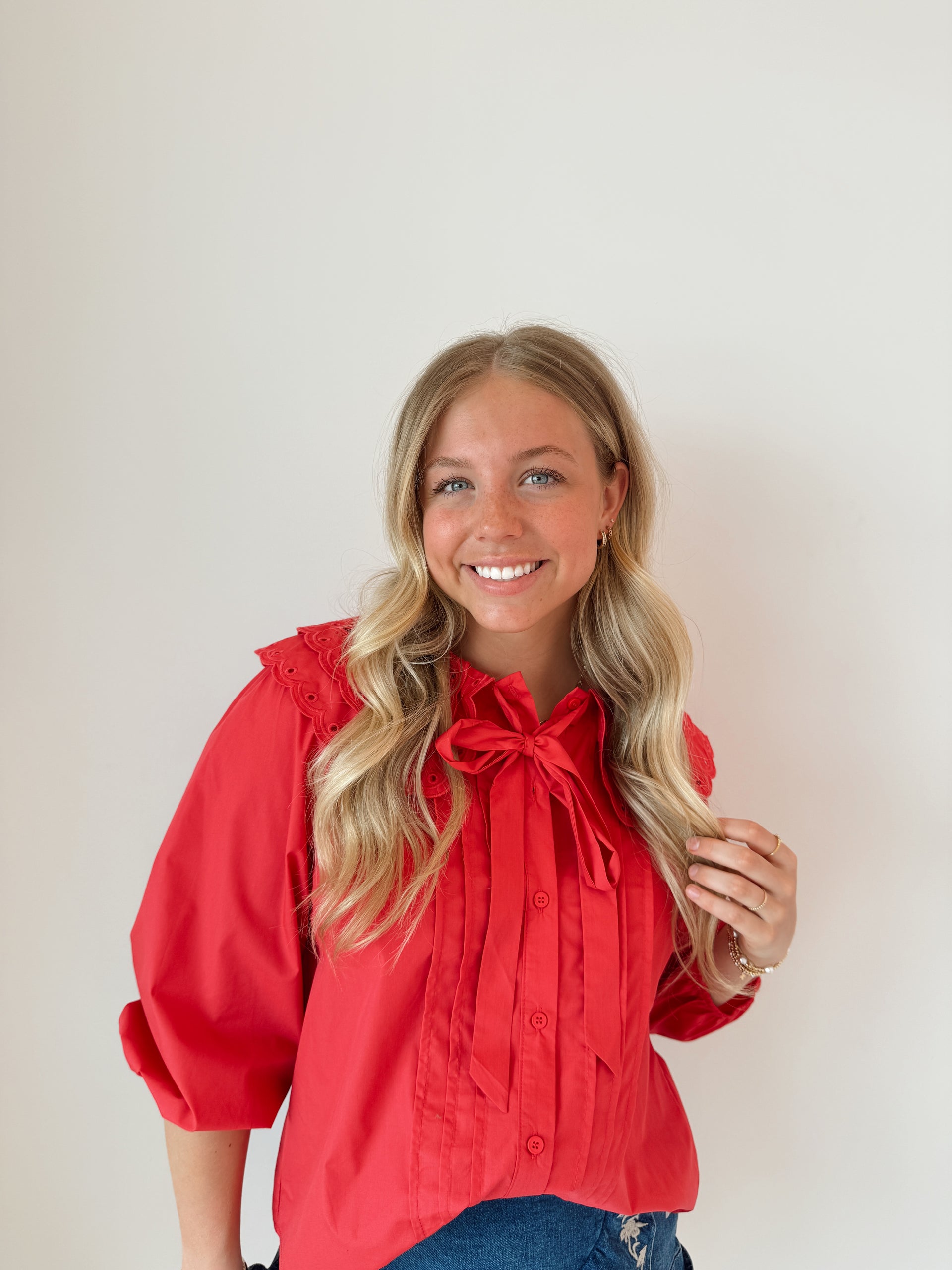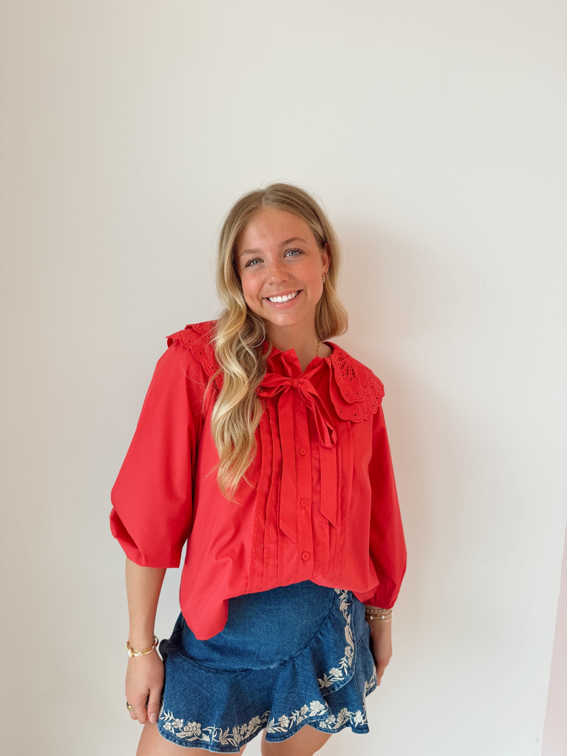 Solid 3/4 sleeve top featuring pin tuck front detail and oversized layered eyelet collar with a tie accent.
