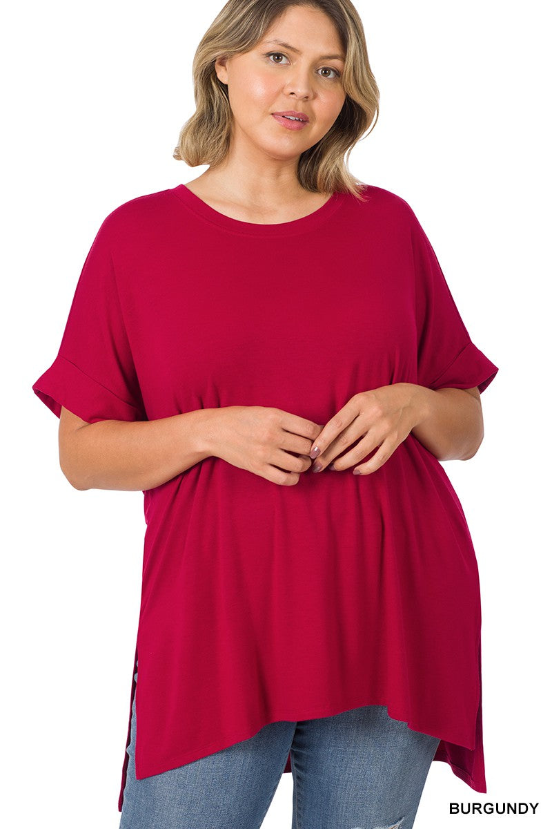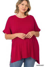 PLUS ROLLED SHORT SLEEVE ROUND NECK TOP WITH SIDE SLIT HIGH-LOW HEM TOTAL BODY LENGTH : 29.5"(front), BUST: 51" approx. - MEASURED FROM 1X ** COLOR MAY VARY SLIGHTLY DUE TO MONITOR RESOLUTION