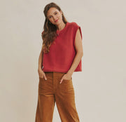 A loose fit exposed seam sweater vest top that is effortless and essential! You’ll reach for it each season.