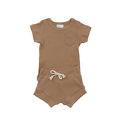 This is an organic two-piece cozy set for babies and toddlers up to 4t! These come with a short sleeve top + tie shorts.