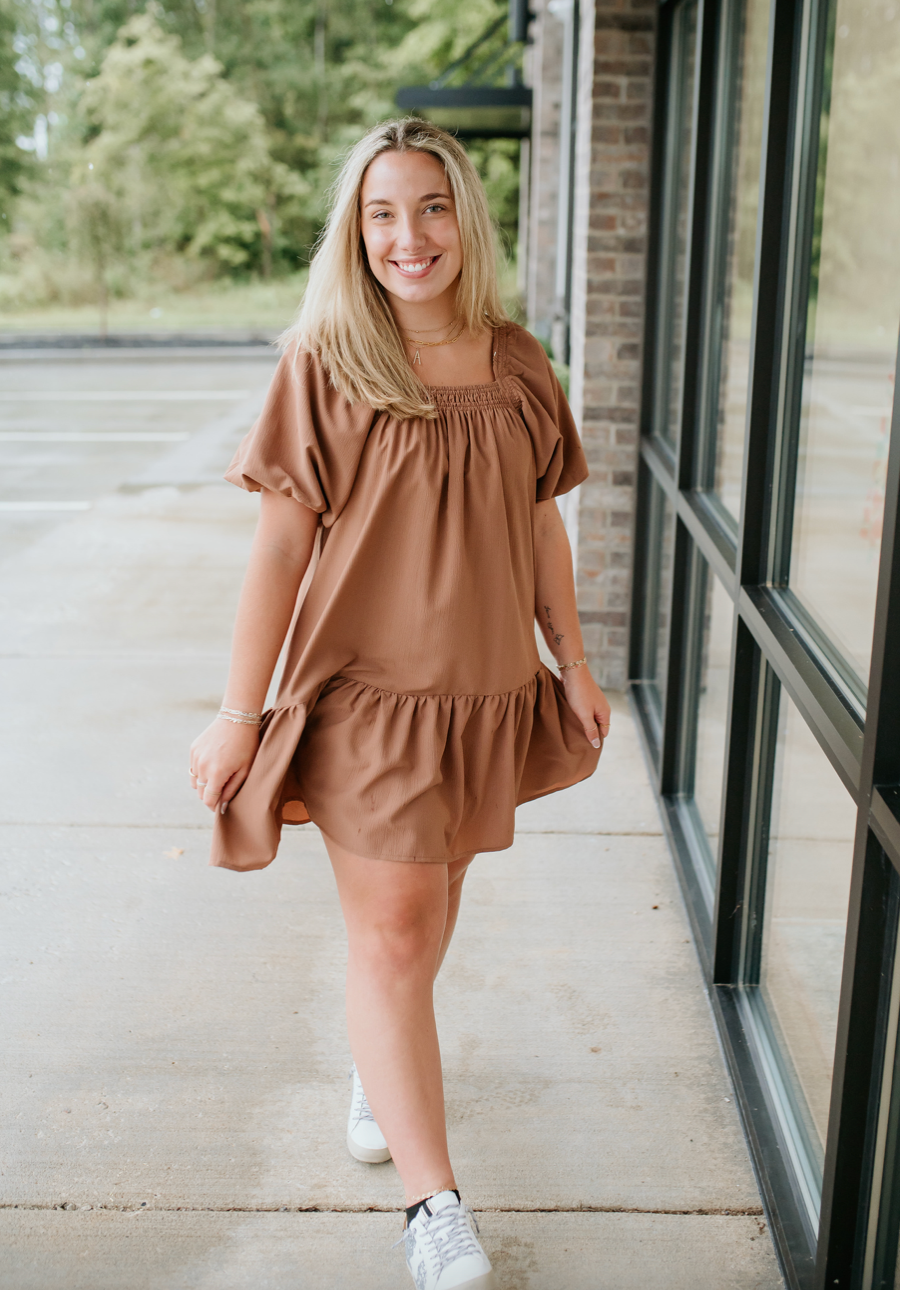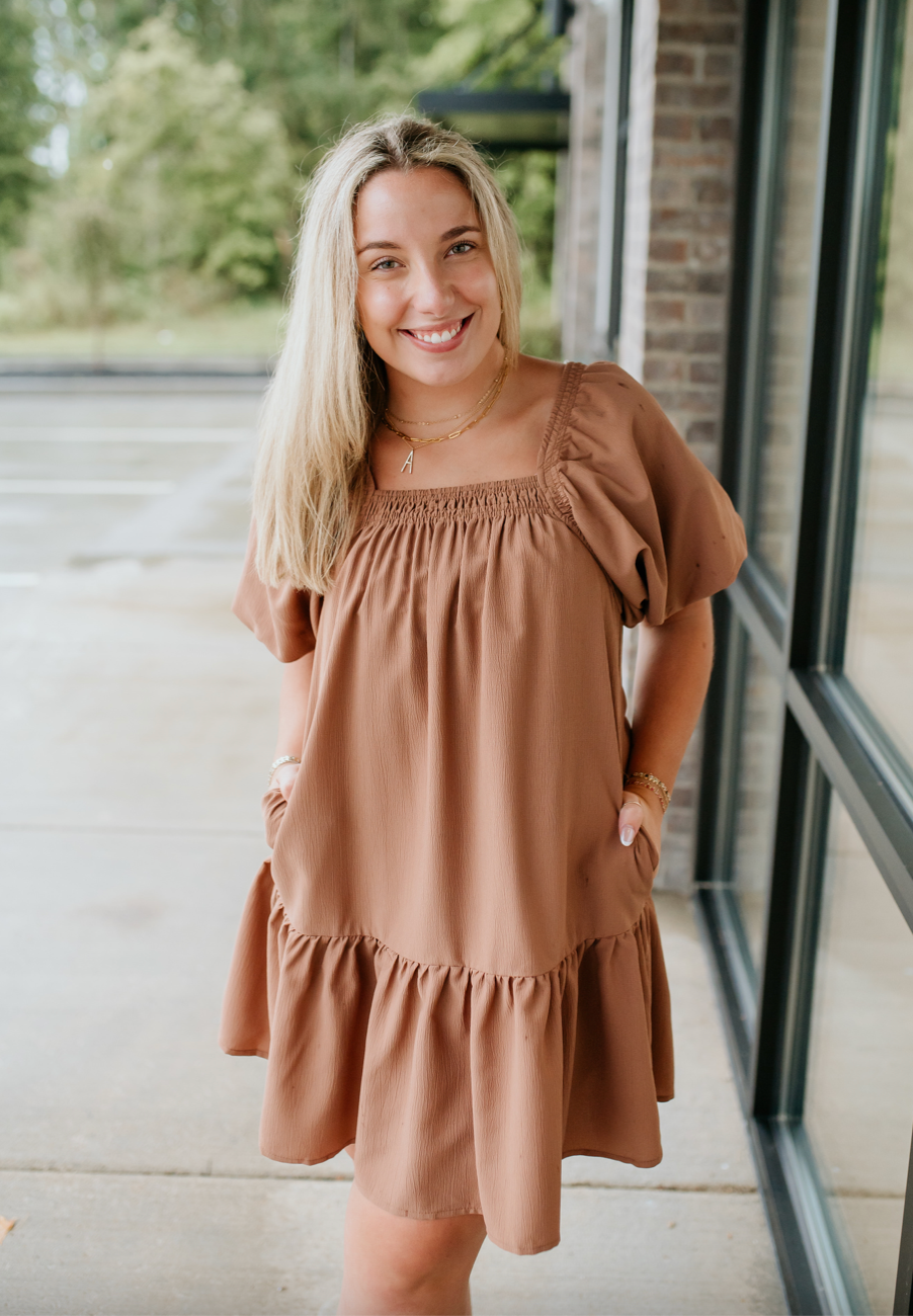 Textured short sleeve square neck dress featuring smocking along neckline. Elasticized puff sleeves. Lined. Woven. Non-sheer. Lightweight.