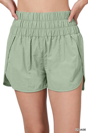 WINDBREAKER SMOCKED WAISTBAND RUNNING SHORTS - BUILT-IN INNER BRIEF - MESH WAIST POCKET - SPLIT HEM - RELAX FIT - SHELL: 100% NYLON - LINING: 96% POLYESTER 4% SPANDEX TOTAL WAIST: 27", INSEAM: 2 3/8" approx. - MEASURED FROM SMALL