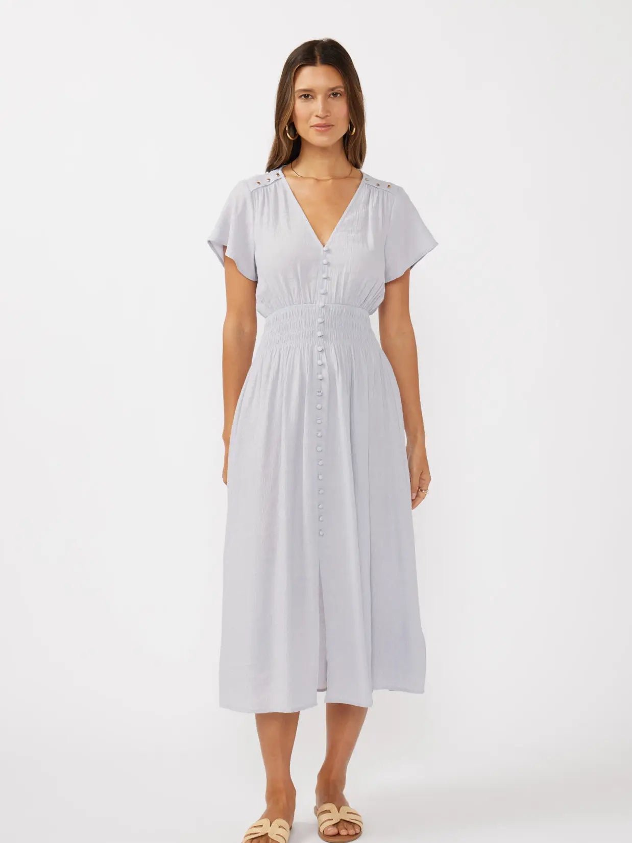 This solid-color short sleeve V-neck button-down midi dress features a smocked waist and front slit, combining comfort and style. The crinkled texture adds depth, while the flutter sleeves and flowing design create a relaxed, feminine look. Delicate gold button accents on the shoulder complete the dress, making it the perfect choice for a chic spring outfit.
