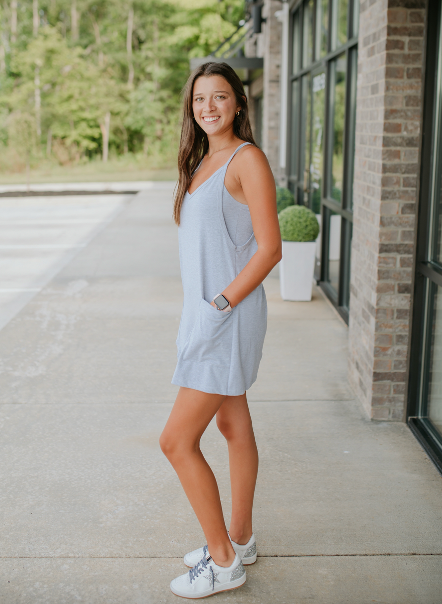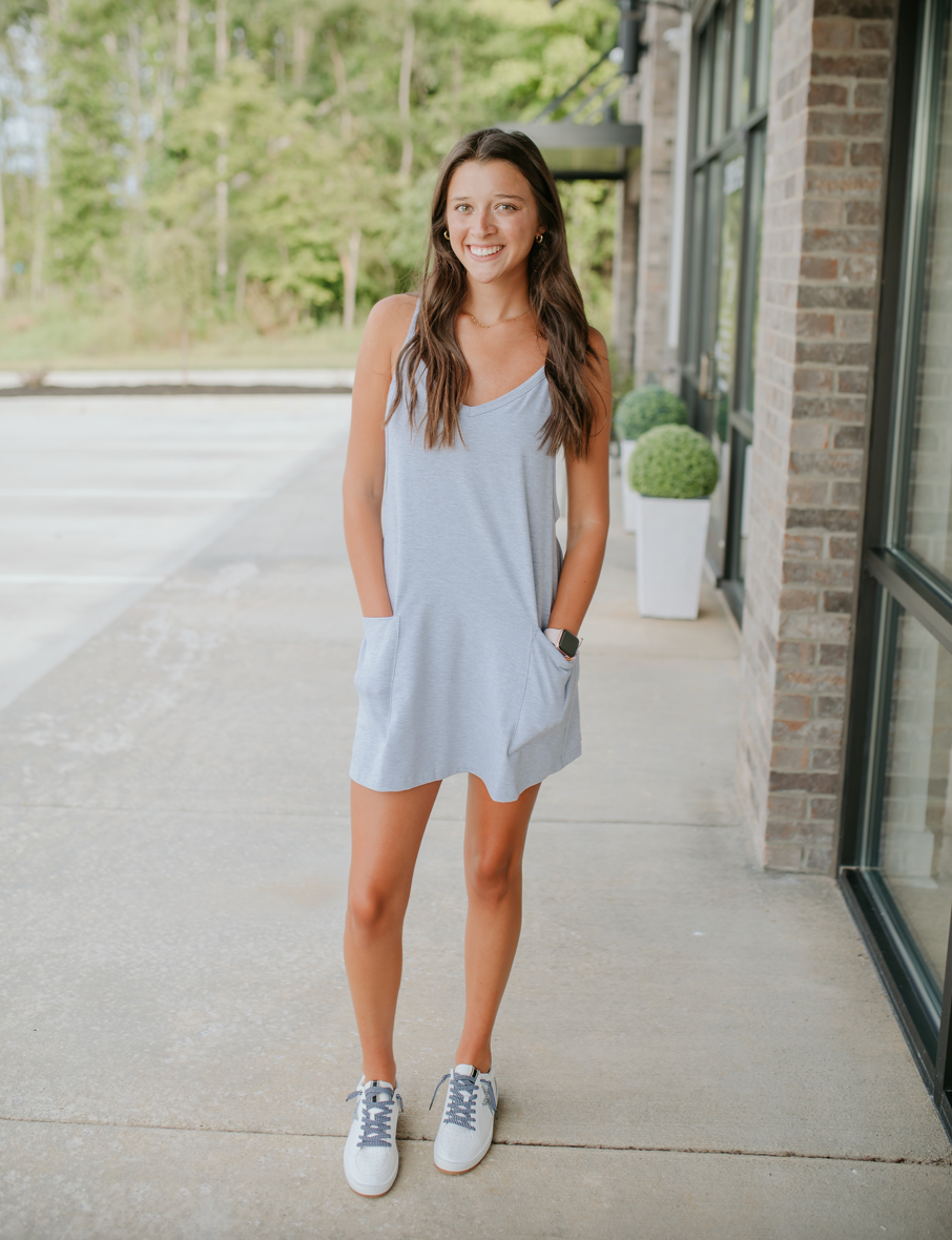 V-neck Jersey Solid Mini Dress With Built In Romper Lining - Matching styles : IJ2067 - Sleeveless - Racer back - Side patched pockets - Built-in romper for comfort & protection - Shorts are not separate