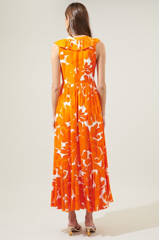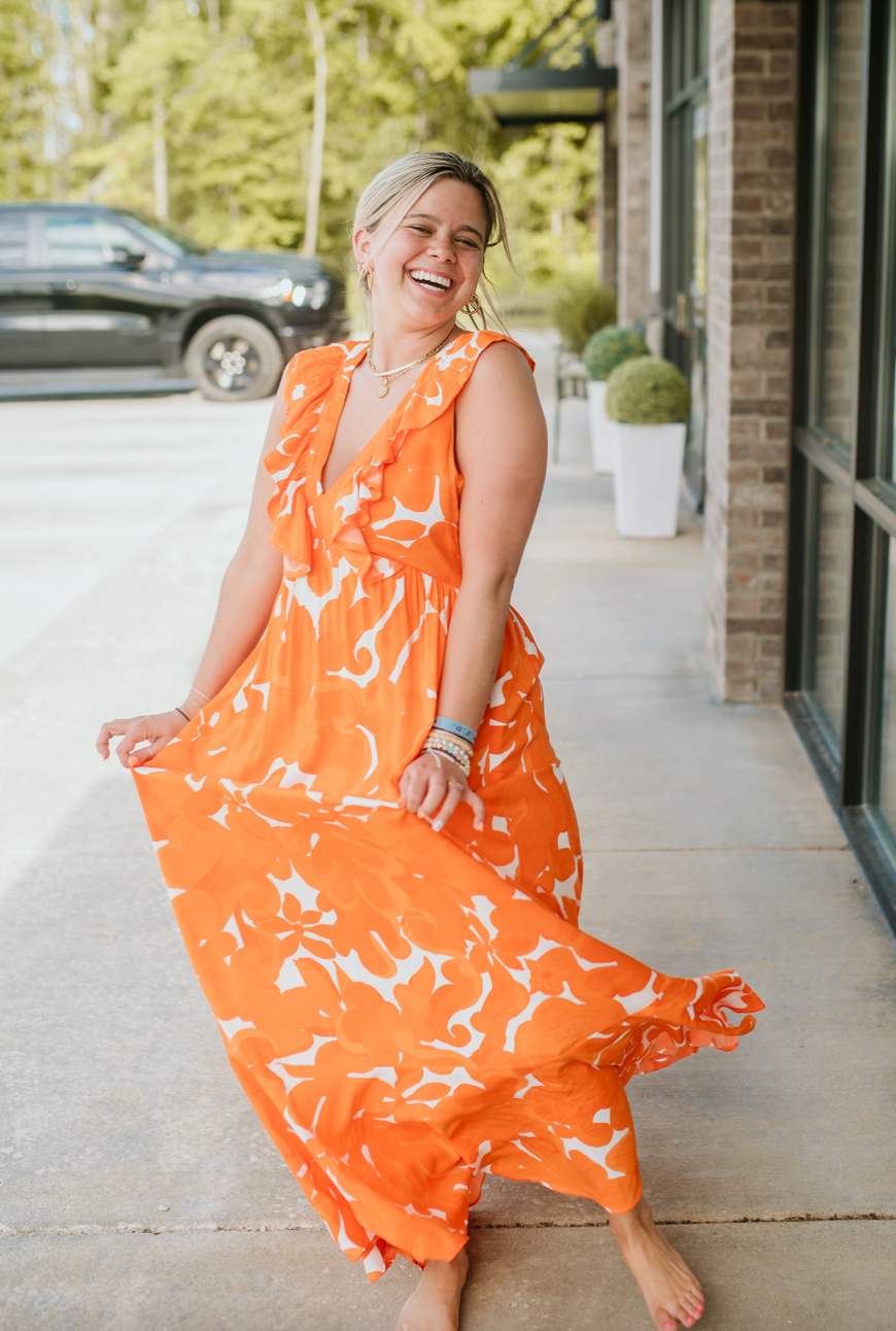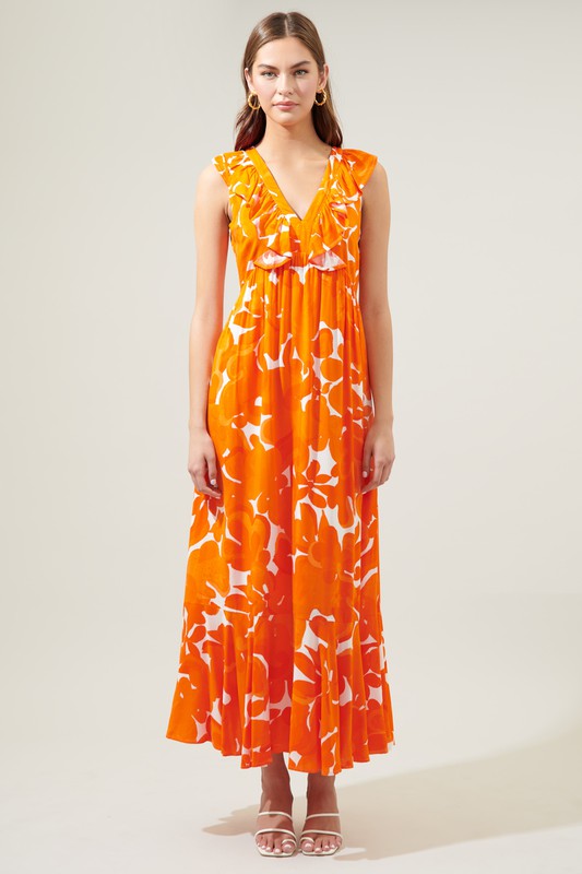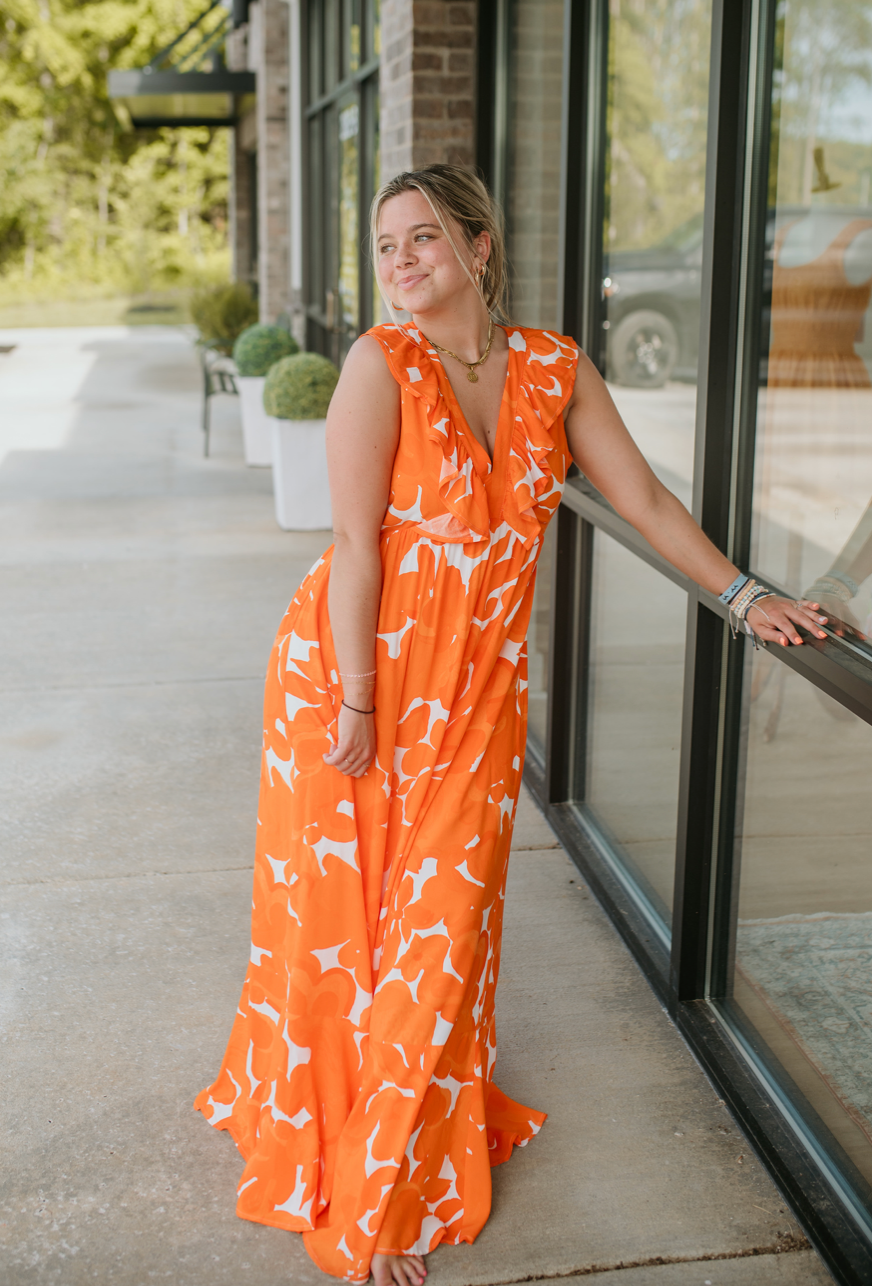 Summer party or weekend brunch, this dress is your new go-to. Large scale orange floral motifs pave the way against the Bayla Maxi. A sleeveless dress that features a deep V neckline, framed by ruffle details from shoulder to waist. An elongated maxi skirt highlights a flouncy ruffle tier hem. - Zipper - Lined - Woven - Ruffles - Color: White Orange