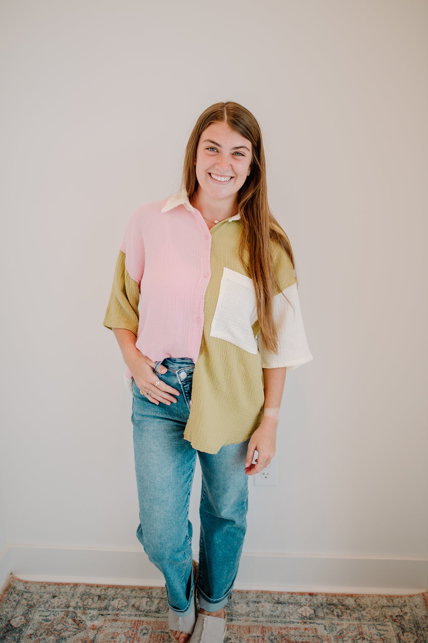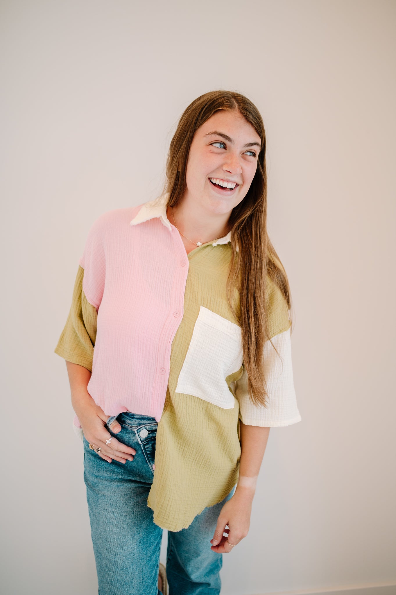 Color block button down top with chest pocket and raw hem detailing. - Very comfy to wear daily. - Best women top - Very Cute women top DOUBLE GAUZE, COLOR BLOCK, CHEST POCKETR, CHORT SLEEVE, BUTTON DOWN, RAW HEM, MULTI COLOR,