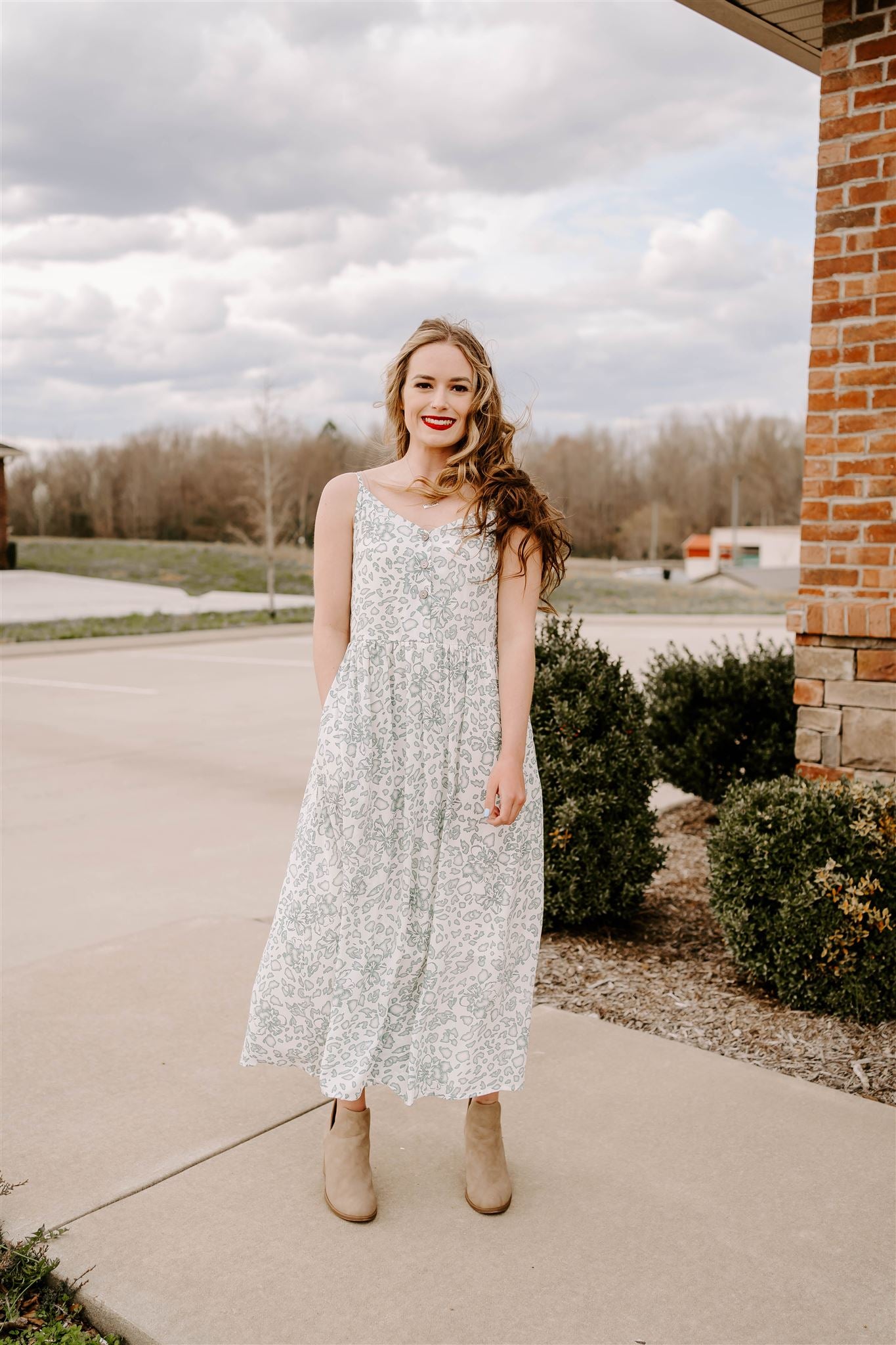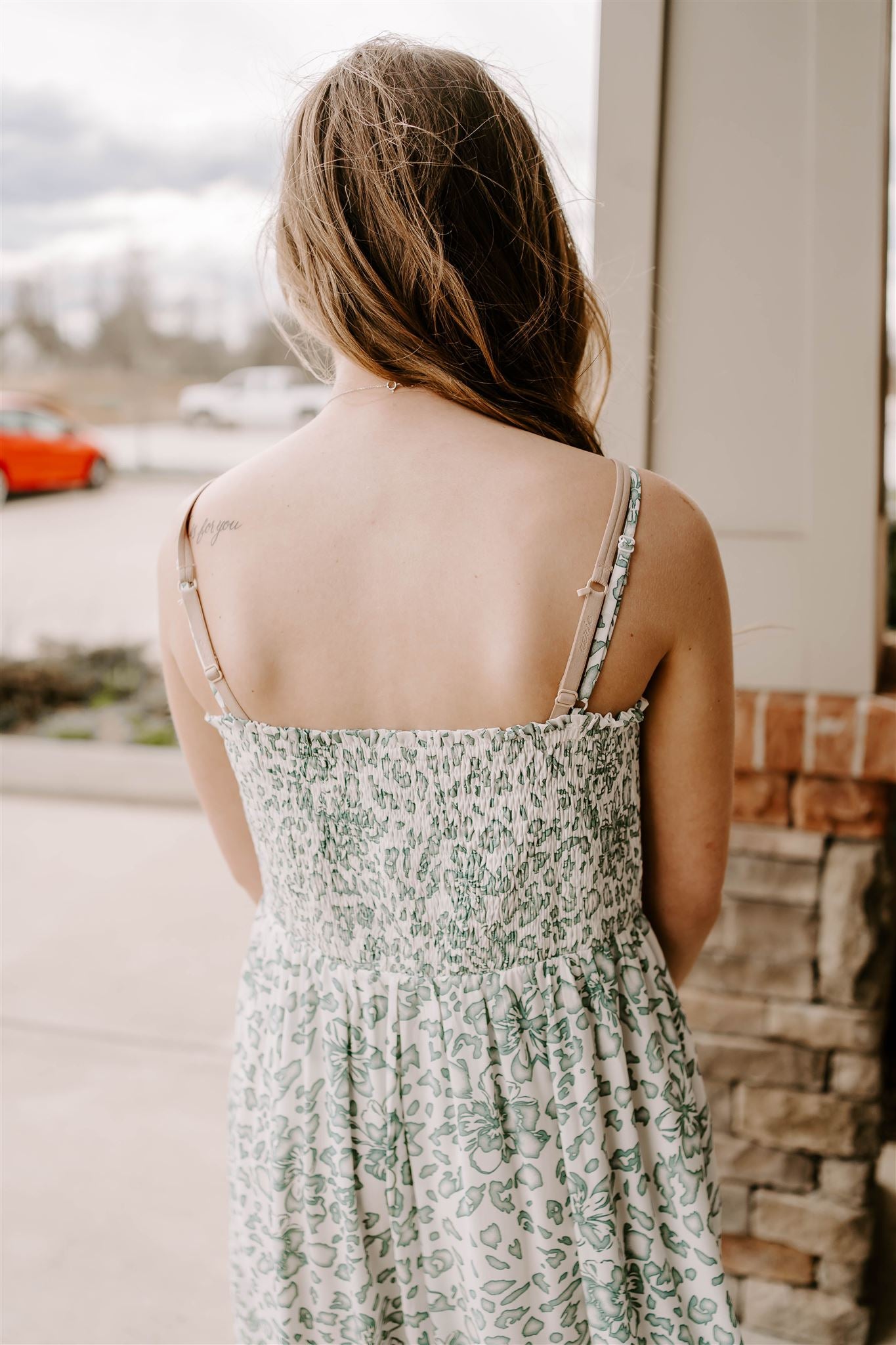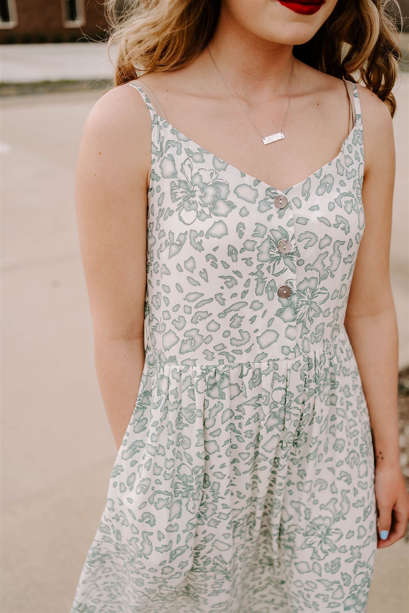 - Floral leopard printed button down midi dress - Floral leopard printed textured polyester - Smocked on back - V-neck with button down on center front - Adjustable shoulder strap - Side seam pockets - Lined