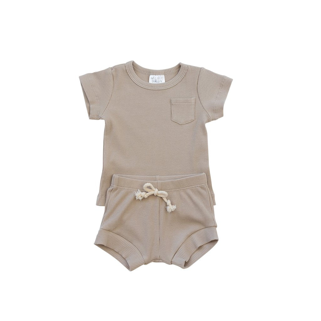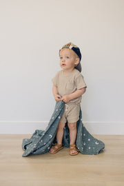 This is an organic two-piece cozy set for babies and toddlers up to 4t! These come with a short sleeve top + tie shorts.