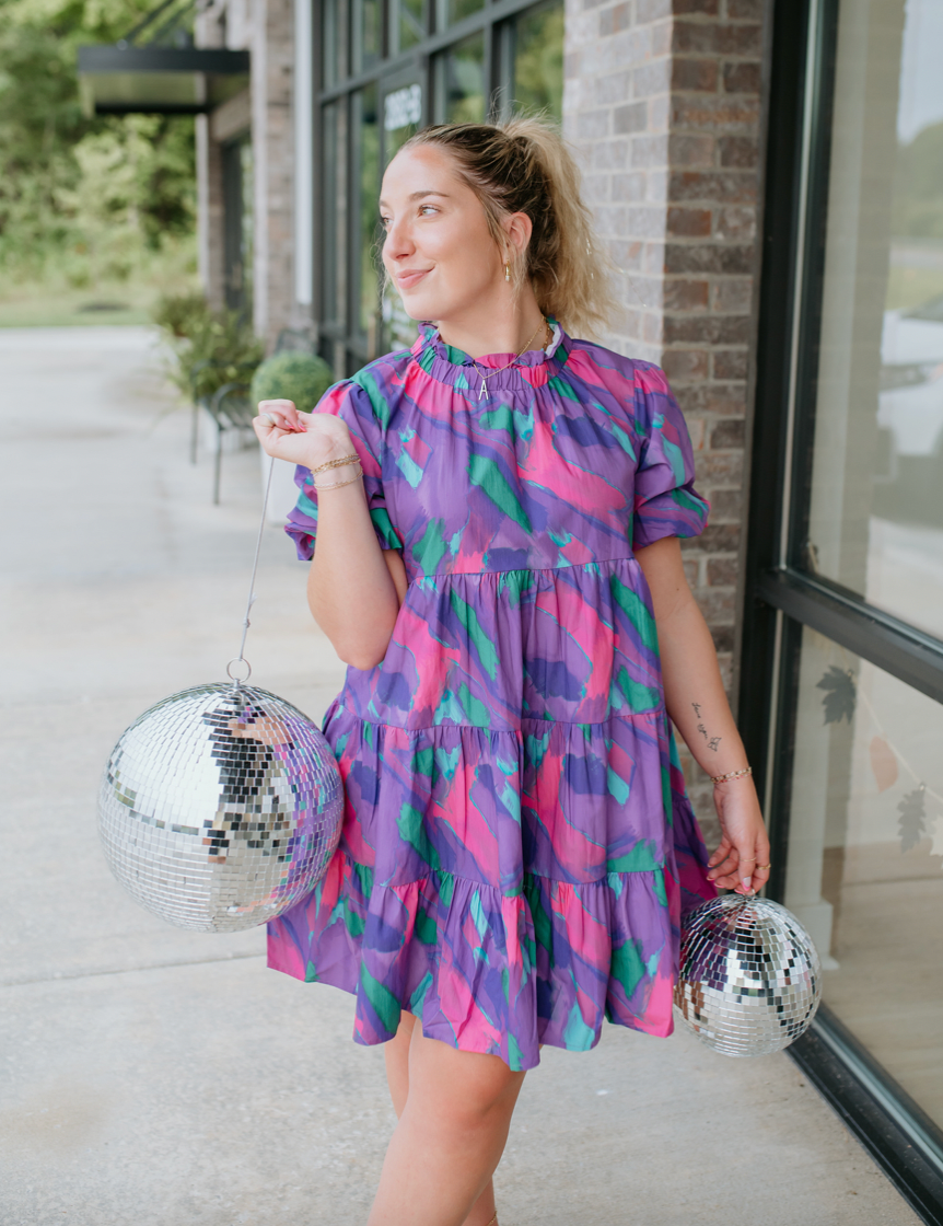 Abstract print babydoll mini dress - Mock neck -Short puff sleeves - Back button-down closure - Ruffled - Tiered
