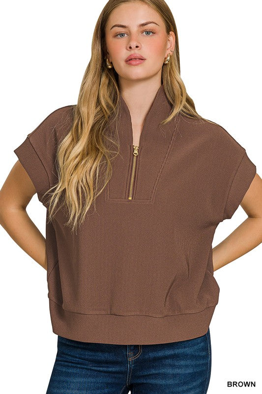 Ribbed high neck half zip top