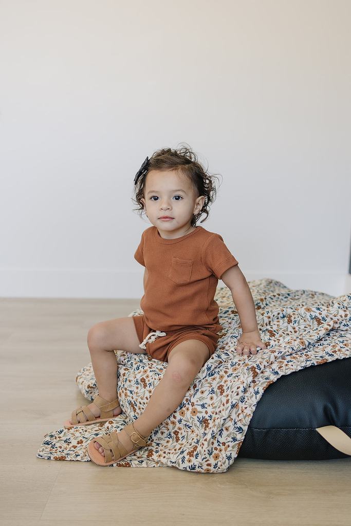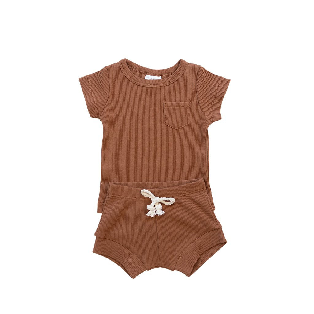 This is an organic two-piece cozy set for babies and toddlers up to 4t! These come with a short sleeve top + tie shorts.