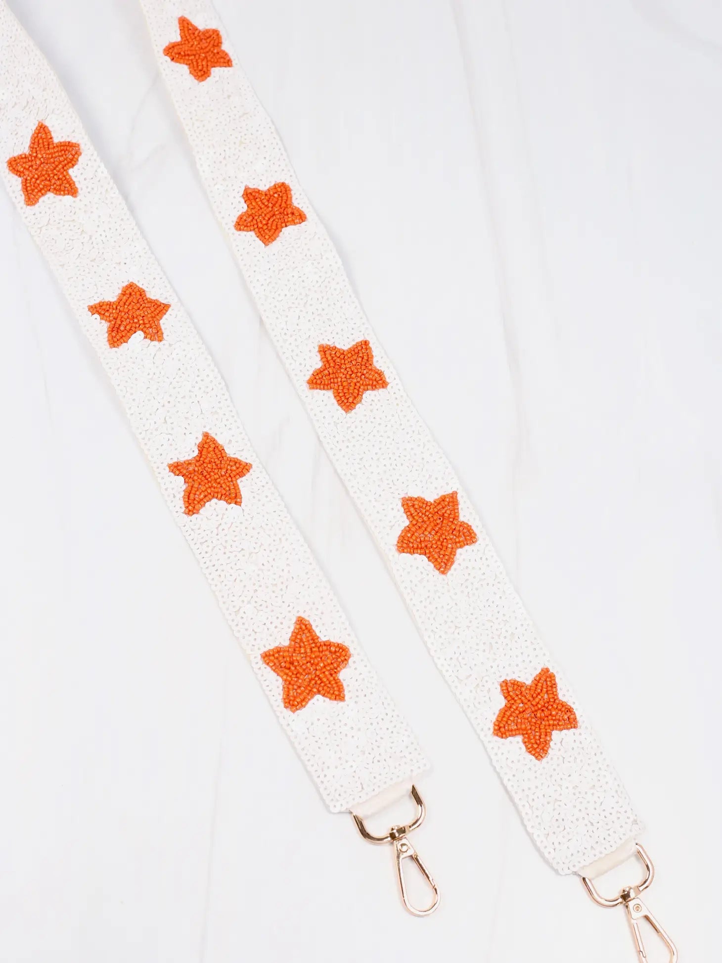 Be concert or game day ready look with this stunning gold sequin crossbody strap! It has white beaded accent stars with gold clips. It will easily attach to any clear bag or handbag with removable strap capabilities. Dimensions: 46.5" including gold clips