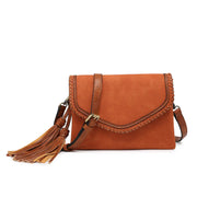 Whipstitch trim envelope crossbody/clutch Monogrammable Magnetic closure Lined Decorative tassel Faux suede material Dimension: 9"L X 7" H X 2" D