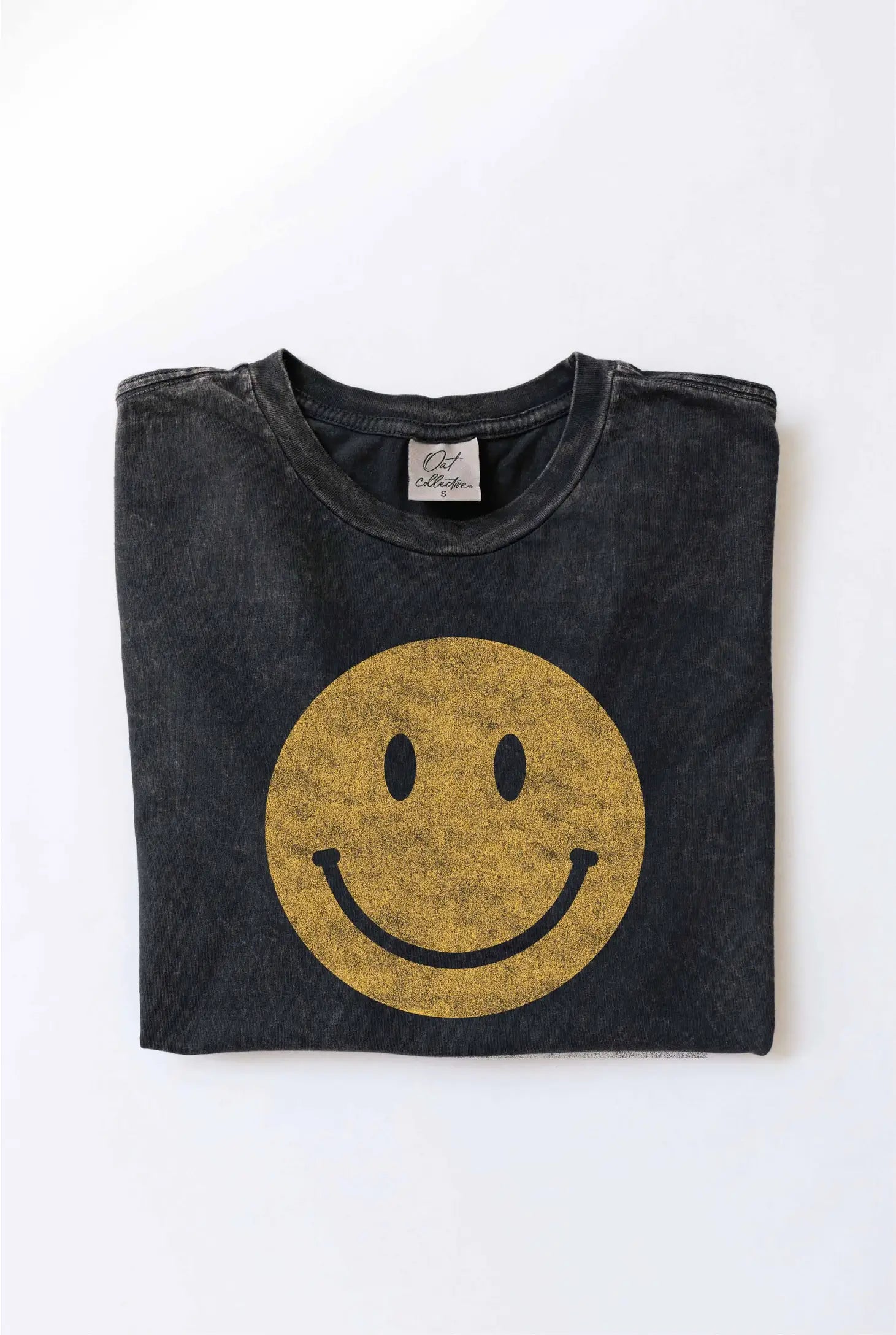 Smiley Face Mineral Washed Graphic Top -100% Premium Cotton Jersey. -Relaxed unisex fit. -Screen Printed with water based ink. -All items are slightly different because of the dying process of the garment.